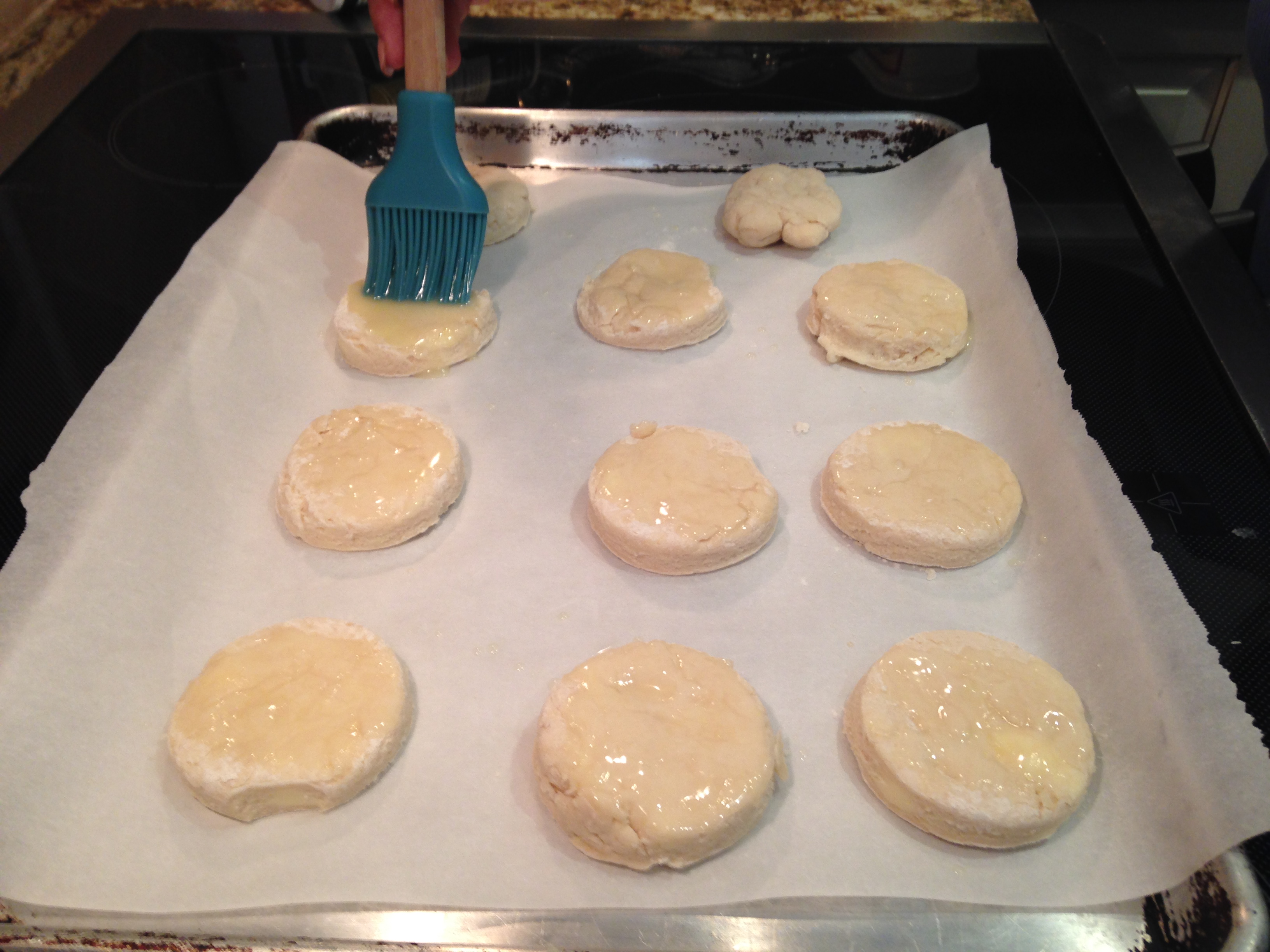 In a large bowl combine flour, sugar, baking powder and salt together. Cut butter into mixture until it begins to look like cornmeal.Make a well with flour mixture and slowly add milk into the middle. Knead dough with your fingers and add milk when necessary. Roll out dough onto a lightly floured surface (we use tons of flour–cant get enough of it) and roll out to desired thickness. Cut with small biscuit cutter. Butter bottom of skillet and place biscuits in pan. Cover and place on top of hot coals in the fireplace. Carefully place some hot coals on top of the skillet cover. Bake for 12 minutes or until golden brown.  Now this is where we throw the Aleman twist into things: Place the biscuits on parchment paper, melt butter, and gently lather a good helping of butter on top of the biscuits.
