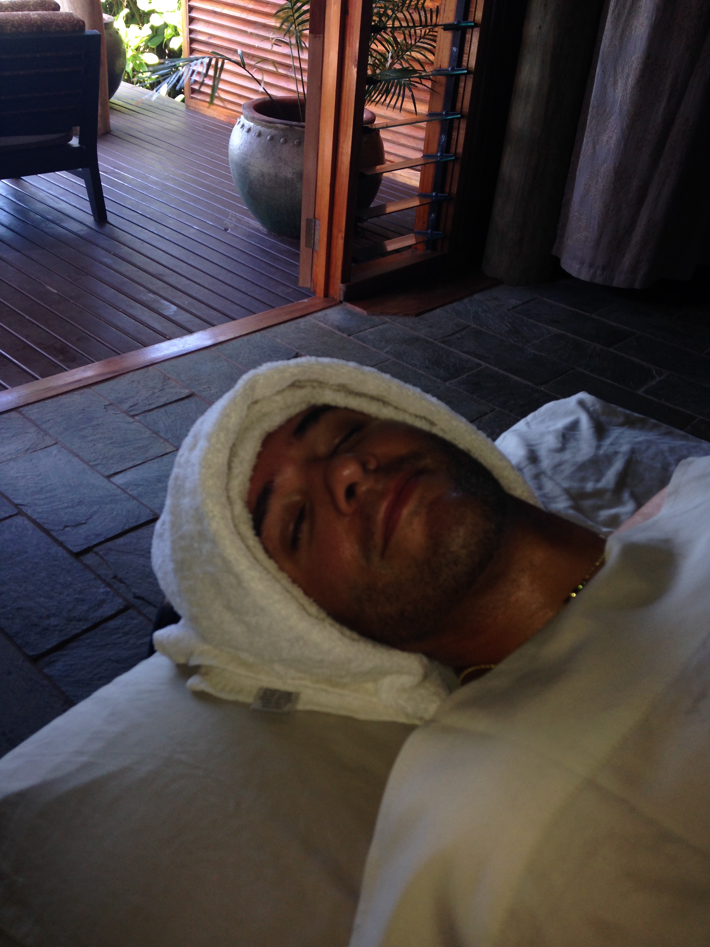 I love this picture! LOL it makes me laugh. This is Sean after his first professional massage! They rolled us up like two snug bugs in a rug. Haha!