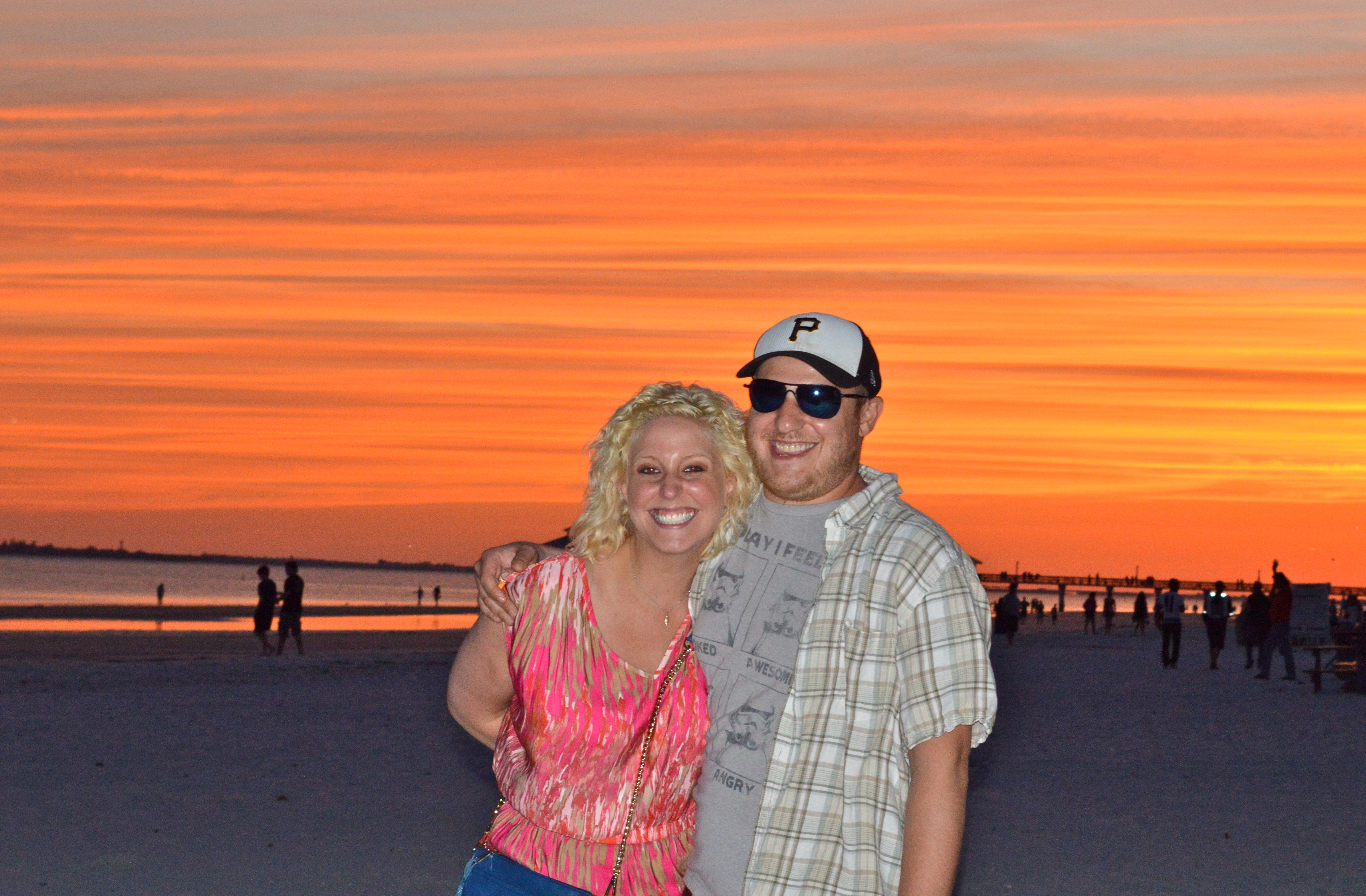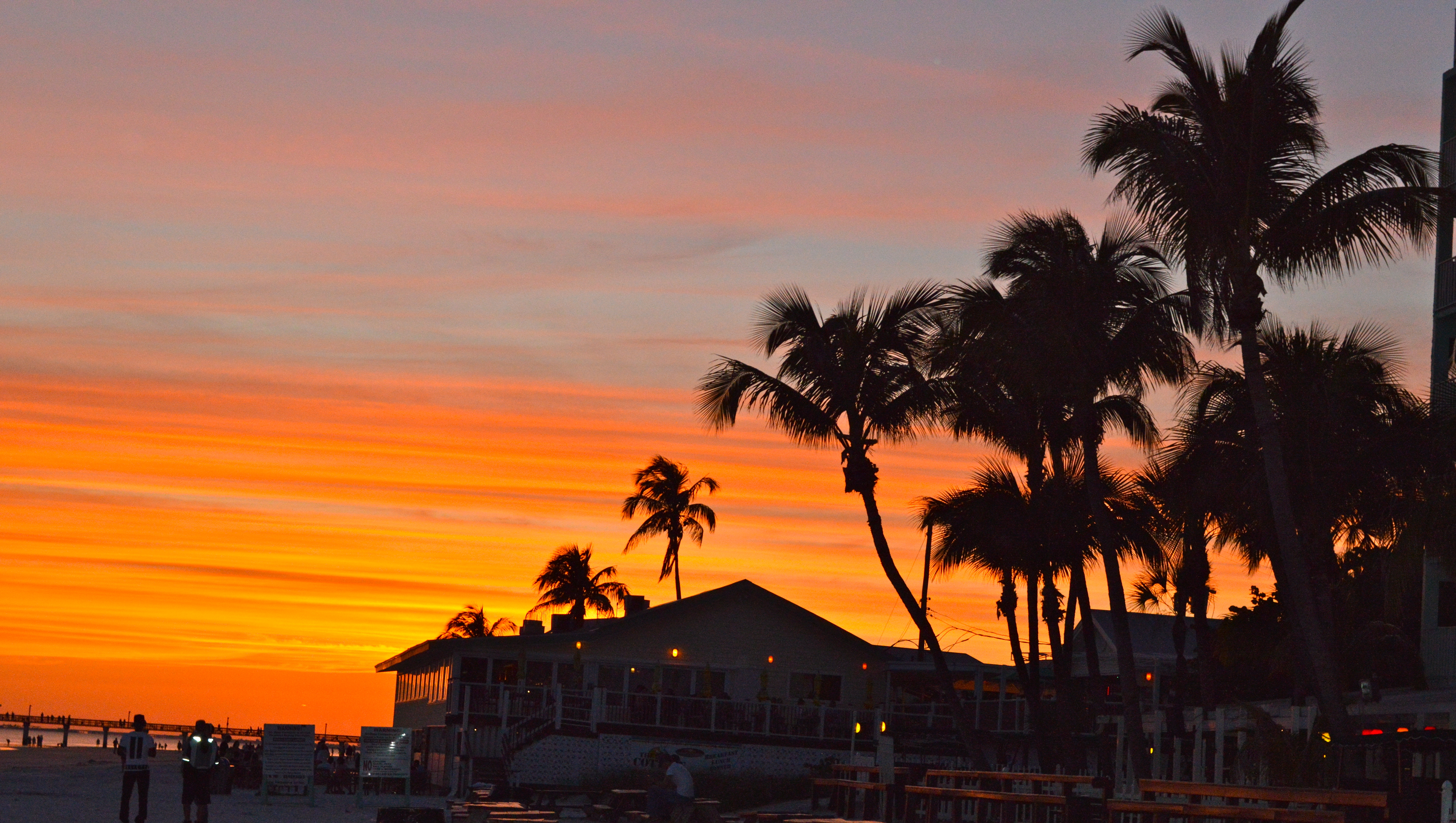 I love these tropical signs. You know you are at the beach when you see these! This one is located right outside Nervous Nellies.Nervous Nellies is known for this gigantic adirondack chair. Adirondack chairs exemplify true Florida lifestyle.The restaurant is located caddy corner underneath the San Carlos Bridge. We enjoyed this lovely view from our table!While dining at Nervous Nellies, you also get to enjoy views of one of the many surrounding islands. You may even catch a pod of dolphins swimming by! I got lucky last time! Just keep your eyes peeled!How can I leave out our musical entertainment for the night?You simply can’t get enough of the Palm Trees down here. I grew up with them and I still love them. They just relax you.Here is Sean, his sister and her husband posing from the top deck at Nervous Nellies. You really cant beat those views!I wish they lived down here! We already miss you!Here is a great picture of Sean and his family standing outside of Nervous Nellies!Now everyone, smile and say cheese! 🙂We got so lucky with the sunset! It was breathtaking. The colors were literally popping out of the sky.It was truly beautiful. I have been waiting for a great sunset like this for a long time.Hi Erin and Nick! 🙂“Lets do something fun!” hahaFlashing Lights Lights Lights! This was taken at the Cottage on Fort Myers Beach.Sean and I had a great time showing Erin and Nick all of the dive bars on Fort Myers Beach. This picture was taken inside the Beached Whale.On Saturday, we woke up early and went to the Naples beach. The weather was perfect, the skies were blue, and there was a nice breeze.SWFL is driven by tourism. Lucky for us, season is over and we were able to get a great space on the beach. This picture would simply not exist during the months of November-April. If you visit the beach during that time, you will find tons of snowbirds, and towel after towel after towel lined up right next to each other. I kid you not, there will be no space to walk.After our time at the beach, we made our way to the pool. This pool is a great example of one of the hidden gems of SWFL I was talking about earlier.. Once you go, you find yourself dying to go back.Look at that blue sky! Don’t you just feel like you are on vacation looking at this pool?This shot was taken in the tunnel underneath the waterfall. I am in love with those wooden panels, and look at those vines!Pure paradise.