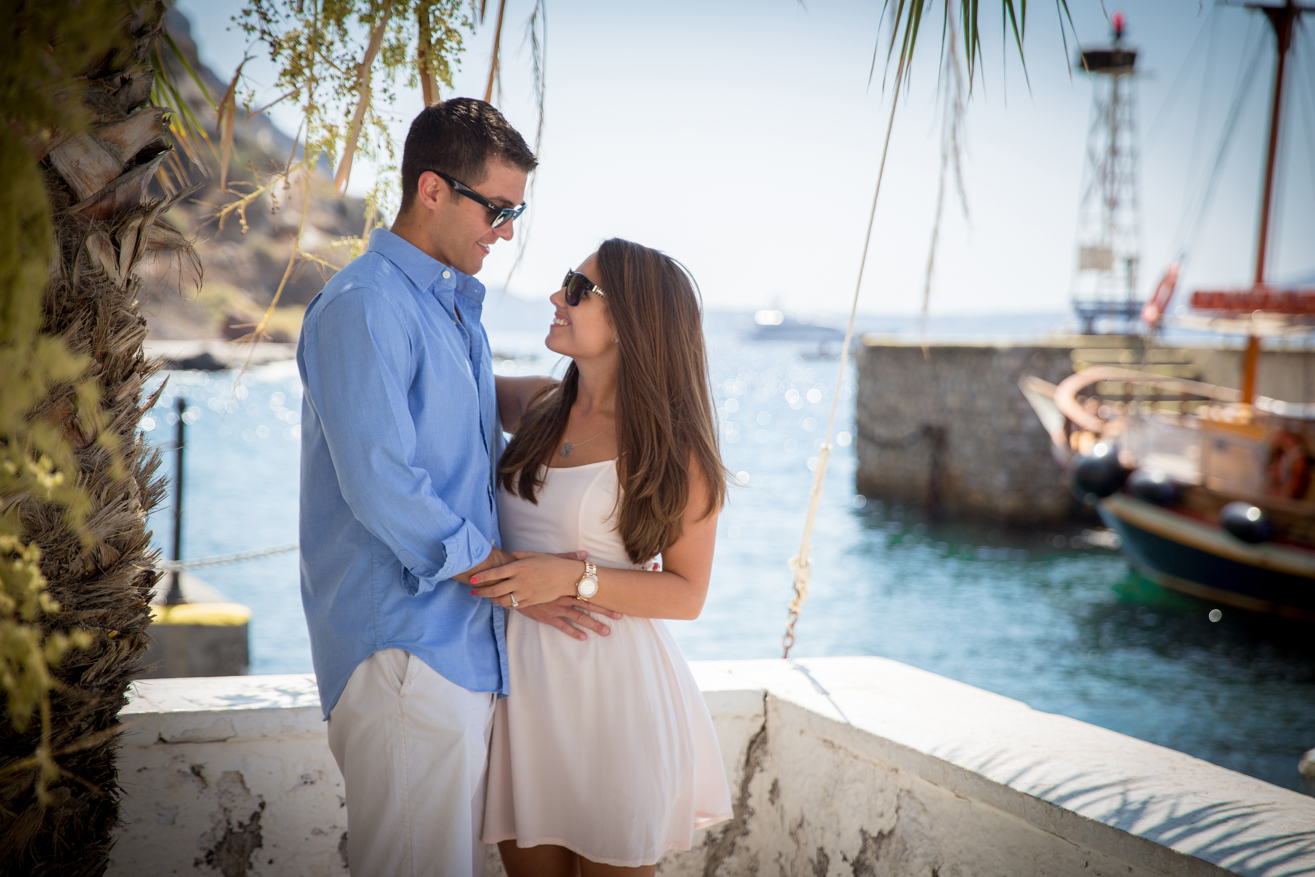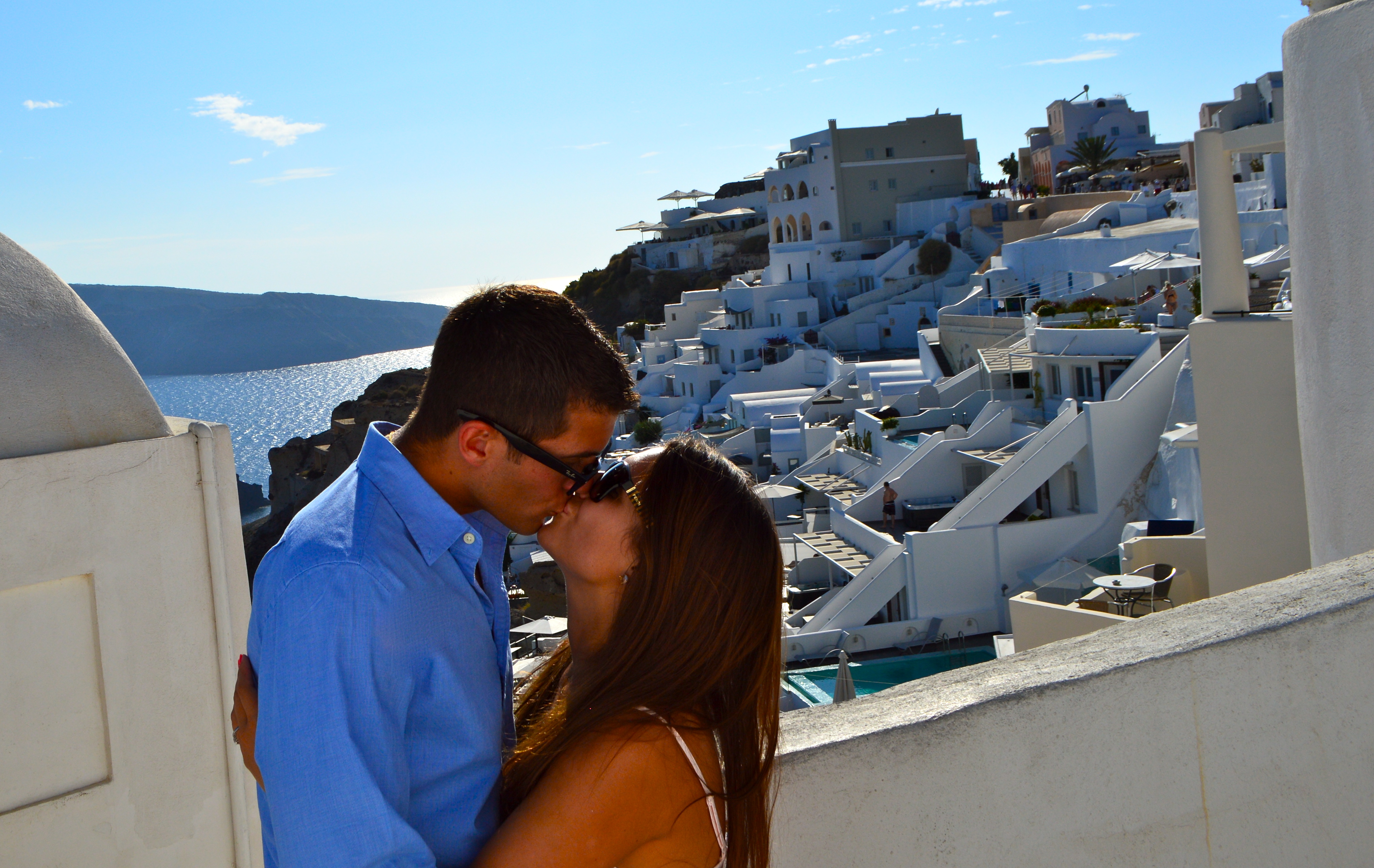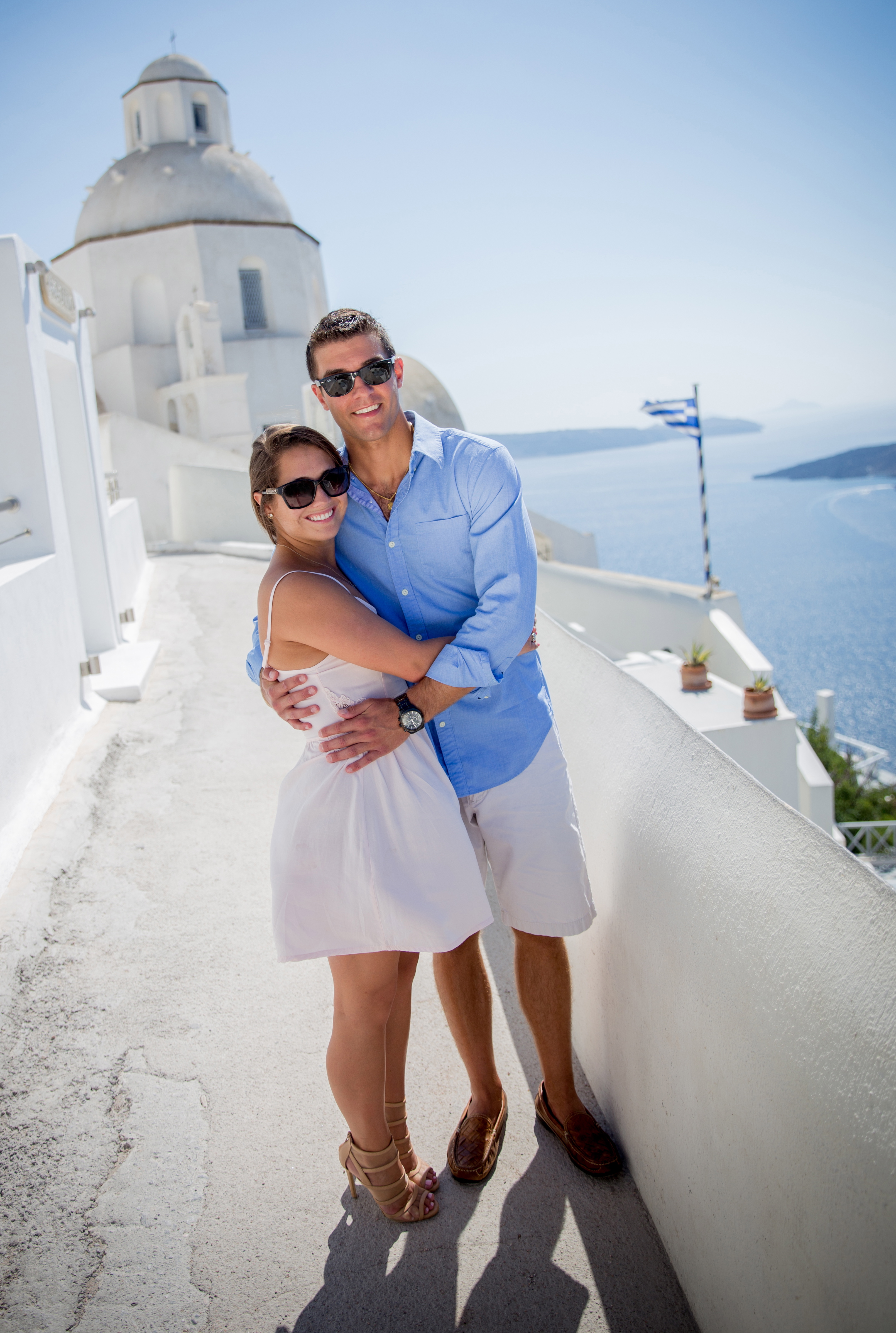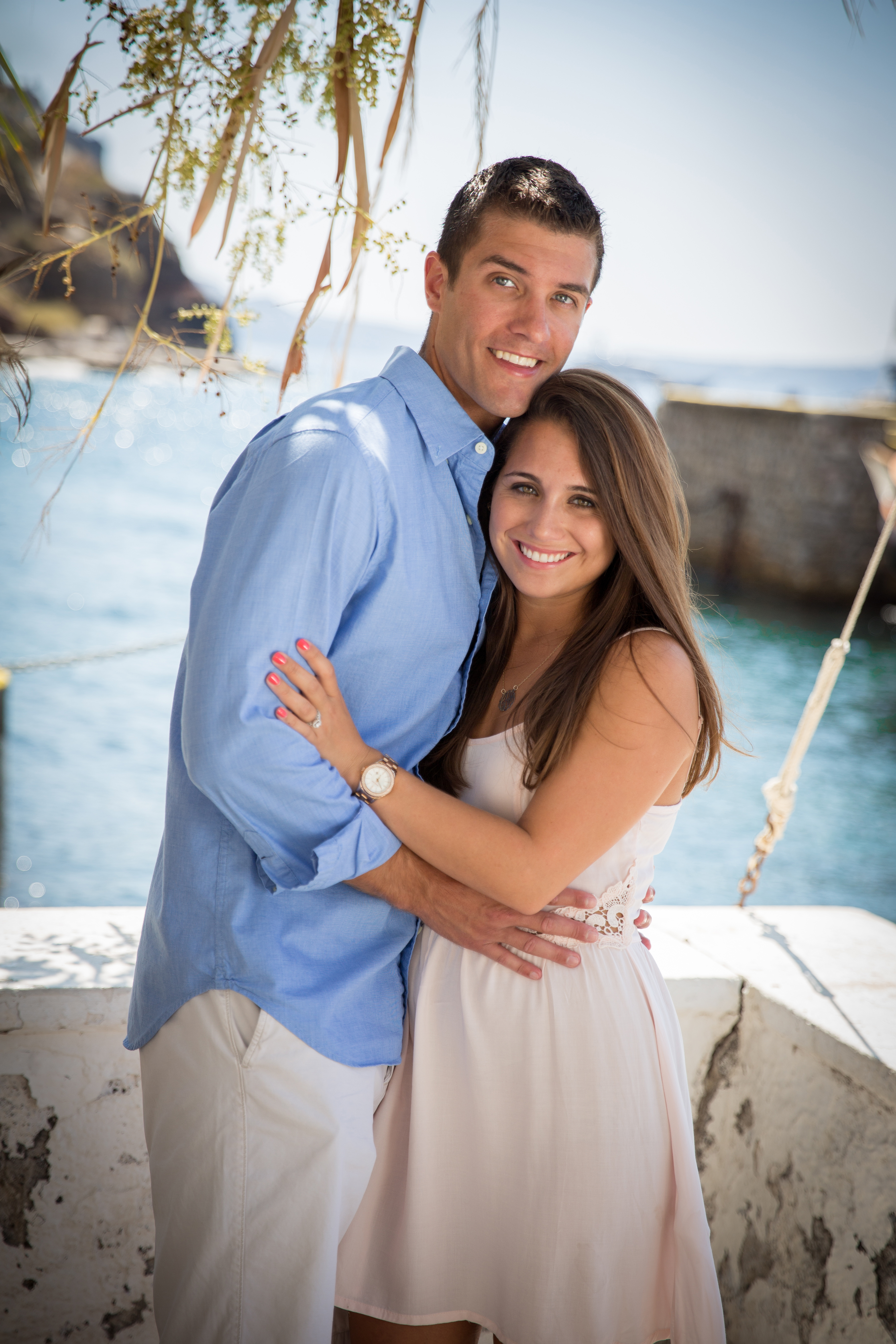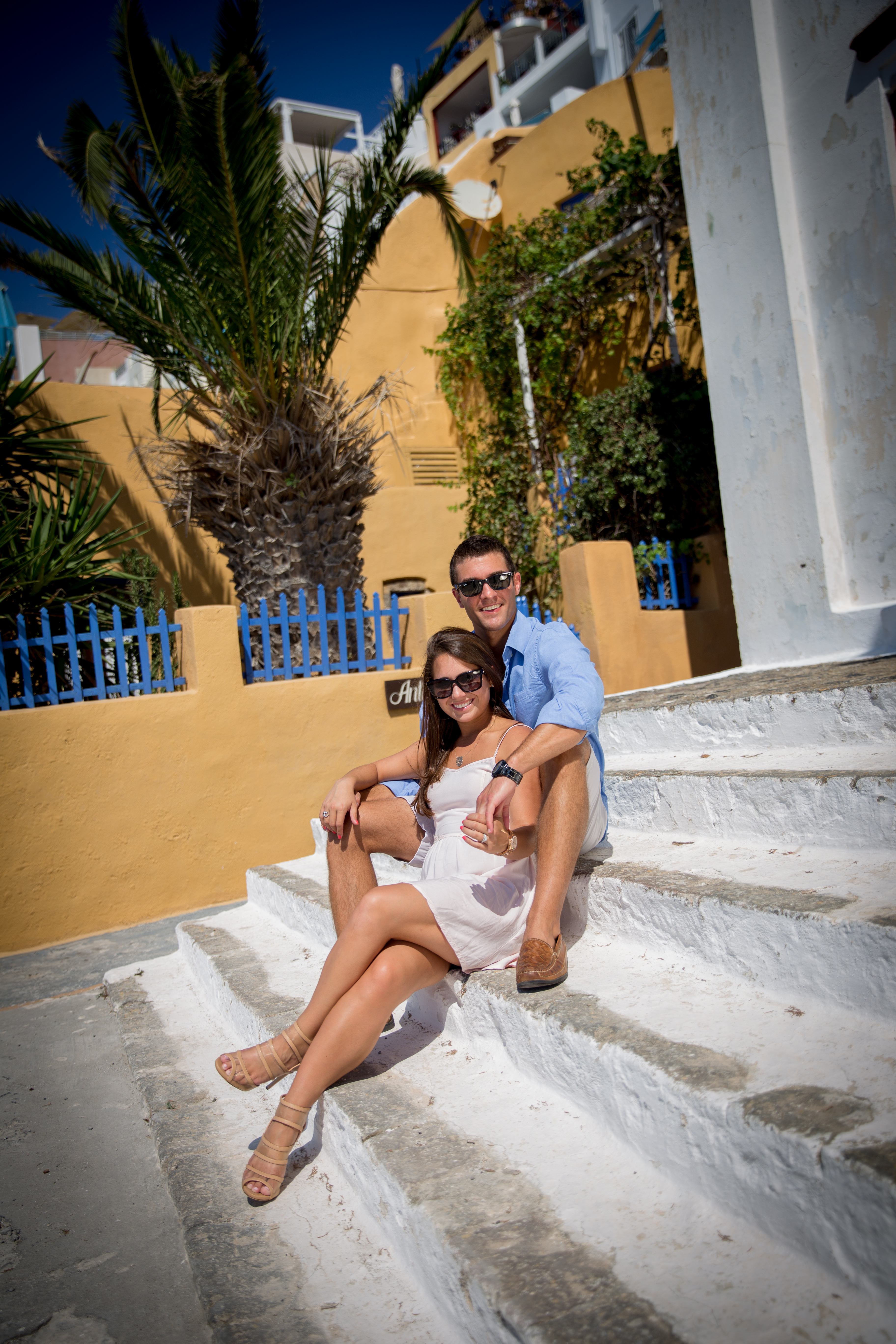 Santorini, Greece, I am almost…not quite…but almost at a loss of words for how unbelievably breathtaking this magical place is. I am NEVER at a loss of words, but when I think of this place I can only think of adjectives that describe its beauty; however, the words gorgeous, beautiful, amazing just don’t seem to do it justice. Everything about Greece is filled with character; however, in Santorini the mass amounts of character that spews from the alley ways and blue, wooden doors is remarkable. Sean and I have said multiple times that we wish we could teleport back. Why can’t I be Dorothy from the Wizard of Oz and click my Steve Madden sandals 3 times and be there?  Seriously if only we could! I think the world would take advantage of this however, but if I could only do it once in my lifetime, I would choose to go back to Santorini. Sean and I were lucky enough to meet two photographers on our cruise that were able to get off the cruise ship and take our engagement photos. They were so friendly and talented! We honestly felt like movie stars with their big silver reflector.